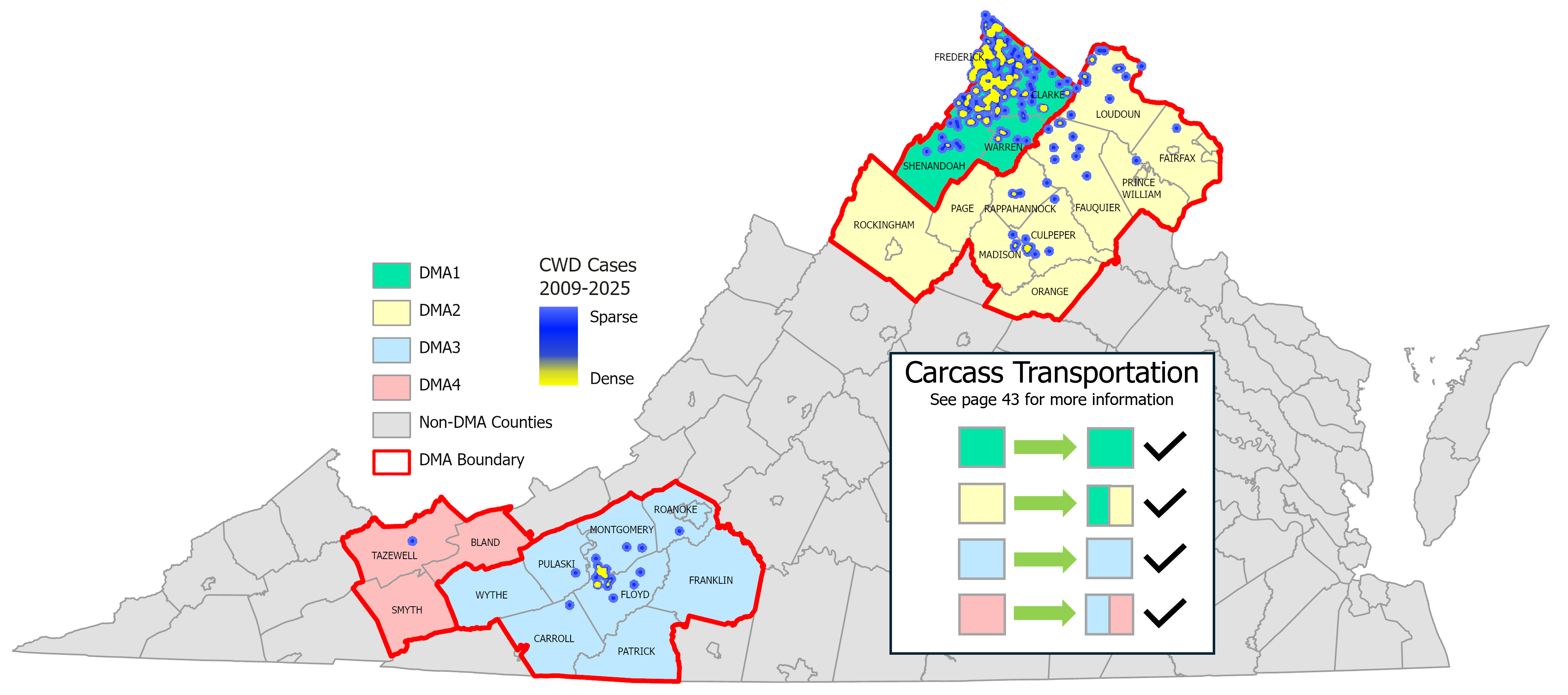 ከዲኤምኤ3 እና ዲኤምኤ4 በስተቀር በቨርጂኒያ ውስጥ ከየትኛውም ቦታ የሚመጡ ሙሉ የአጋዘን ሬሳዎች በህጋዊ መንገድ ወደ ዲኤምኤ1 ሊጓጓዙ ይችላሉ። ከDMA3 እና ከDMA4 የሚመጡ አጋዘን በህጋዊ መንገድ ወደ DMA1 ሊገቡ አይችሉም። ከDMA2 የሚመጡ አጋዘን በህጋዊ መንገድ ወደ DMA1 ሊገቡ ይችላሉ።