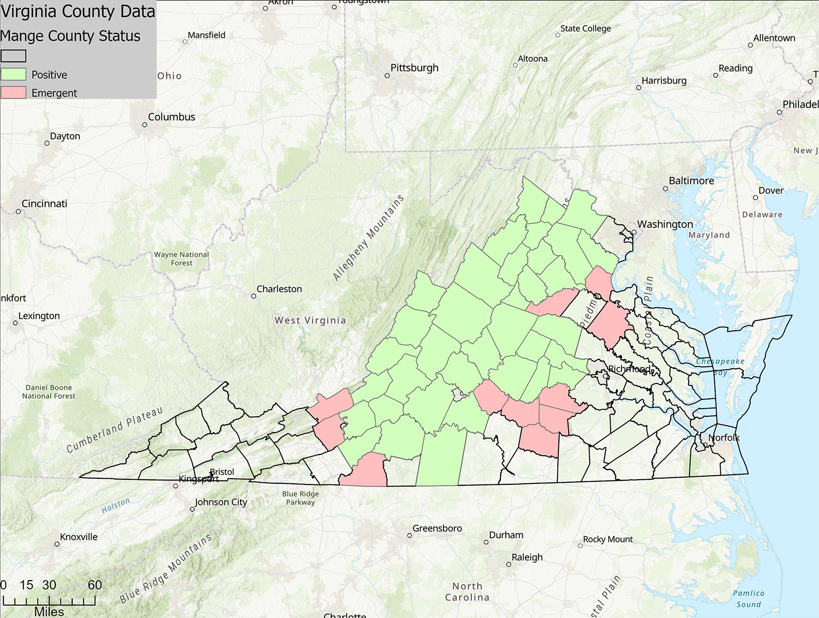 ምንም እንኳን ጥቁር ድቦች ለተለያዩ ማንጅ ዓይነቶች የተጋለጡ ቢሆኑም በቨርጂኒያ ውስጥ sarcoptic mange በጣም አሳሳቢ ነው። ከ 2014 እስከ 2017 ፣ አልፎ አልፎ የሚከሰቱ የማንጌ ዘገባዎች በዋነኝነት ያተኮሩት በሰሜን ምዕራብ የተራራ አውራጃ ፍሬድሪክ እና ሼናንዶህ ላይ ነው። ከ 2018 ጀምሮ፣ ሪፖርቶች በድግግሞሽ እና በጂኦግራፊያዊ ስርጭት ጨምረዋል፣ እና ማንጌ በ 24 አውራጃዎች (ከጁላይ 2024 ጀምሮ) ተረጋግጧል። DWR ከዚህ በታች እንደተገለጸው የማጅ ምልክቶችን እያሳየ የሚመለከት ማንኛውም ሰው ፎቶዎችን እንዲያነሳ፣ ትክክለኛ ቦታዎትን እንዲያስተውል (ከተቻለ የጂፒኤስ መጋጠሚያዎችን ይውሰዱ) እና ይህንን መረጃ ለVA Wildlife Conflict Helpline በ vawildlifeconflict@usda.gov ወይም (1-855-571-9003) ላይ እንዲያቀርቡ ይጠይቃል። እነዚህ ሪፖርቶች በመሬት ገጽታ ላይ ያለውን የማጅ ስርጭትን እና ድግግሞሽን ለመከታተል በጣም አስፈላጊ ናቸው፣ እንዲሁም የቁጥጥር እና የአስተዳደር ለውጦችን ለማድረግ አስፈላጊ መረጃዎችን ይሰጣሉ። ከዚህ በታች እንደተብራራው፣ በምርምር ጥረቶች ወቅት የህዝብ ሪፖርቶች በስፋት ጥቅም ላይ ይውላሉ።
