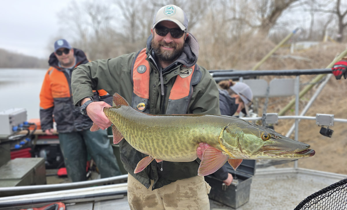 የአሳ ማጥመጃ ባዮሎጂስት ጄሰን ሃላቸር በወንዝ ህዝብ ጥናት ወቅት የተሰበሰበውን ውብ ሙስኪ ያሳያል።